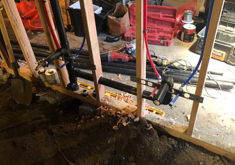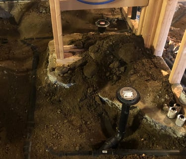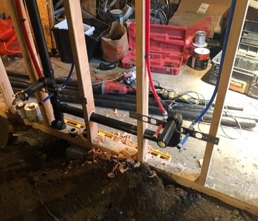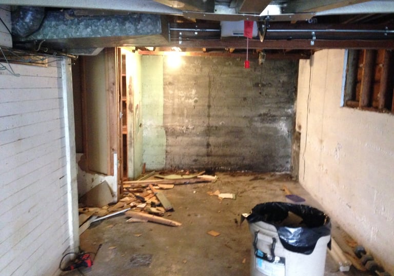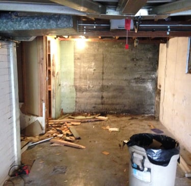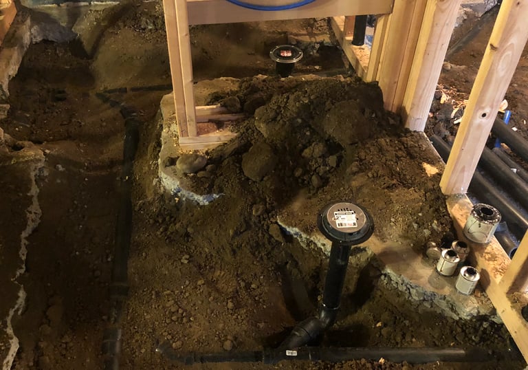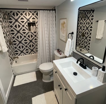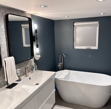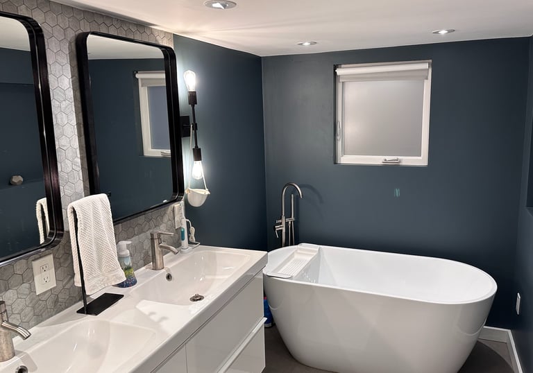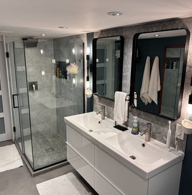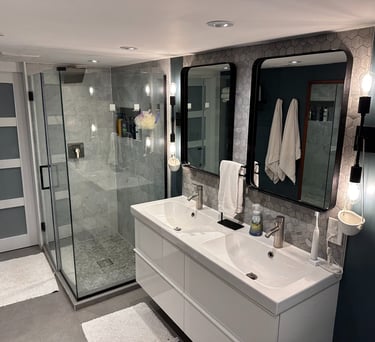 This house needed a primary bathroom with a soaking tub and marble shower. We too an existing basement patio and brought in water, sewer, and heat. We designed and installed a clean, modern bathroom and a primary bedroom.