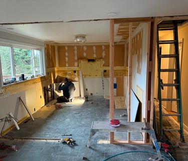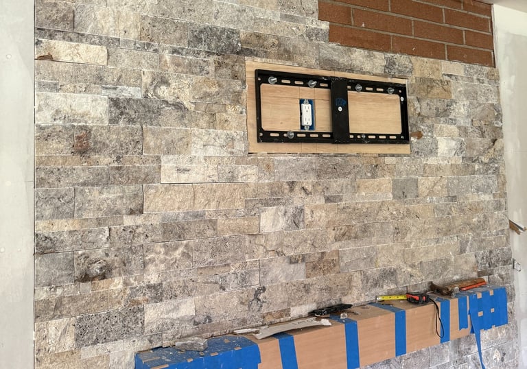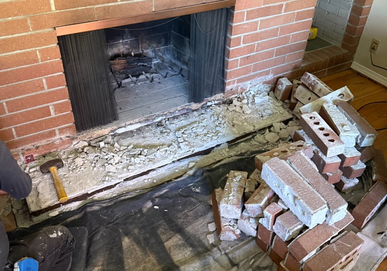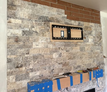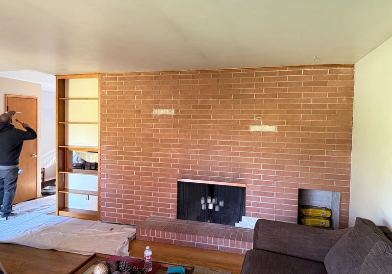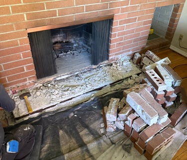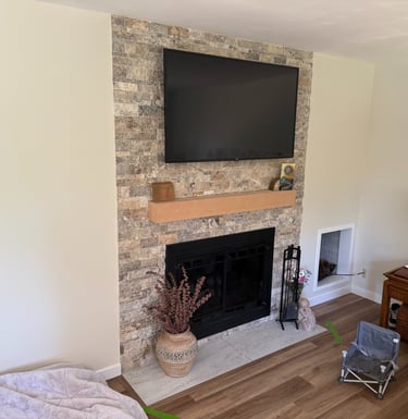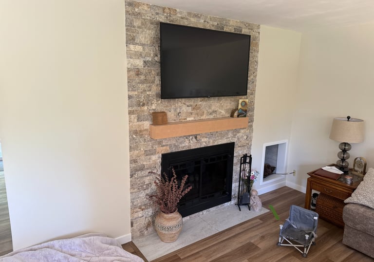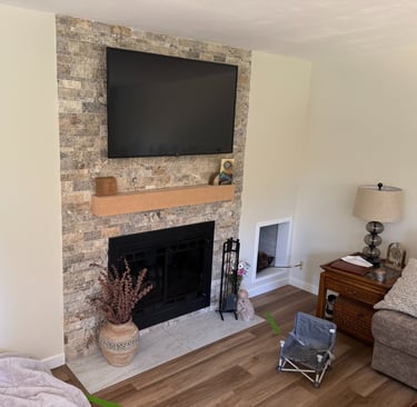 Our customer wanted a brighter, happier living room. We opened up the walls by removing some built-ins, removed the fireplace surround, add electrical for tv, added recessed lighting, added drywall over the brick for a more modern look, add a customer wood mantle, and finished it with split-face stone.
