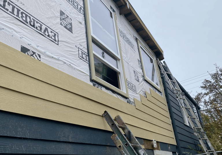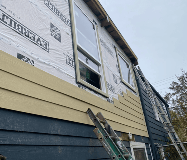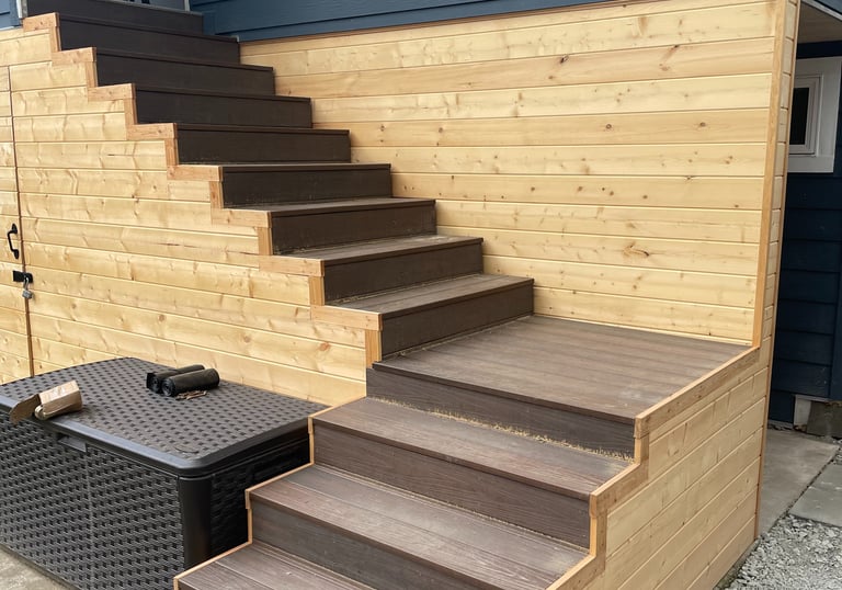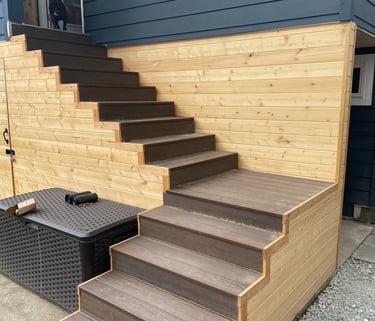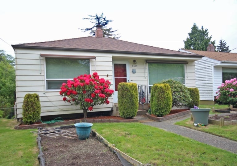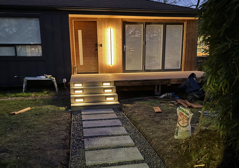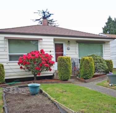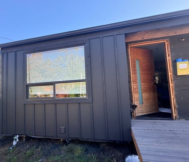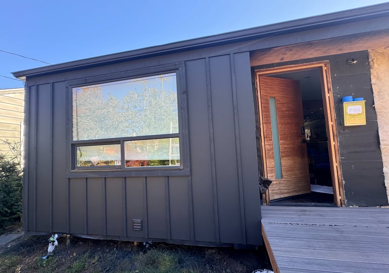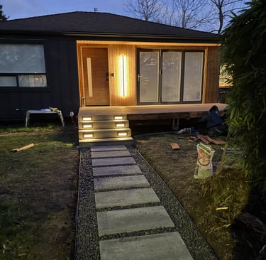 New siding, black paint, modern lighting, trex decking, natural wood finishes, and a folding glass door updates this 1940's craftsman to a modern Pacific Northwest home.