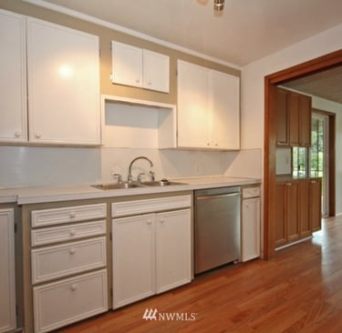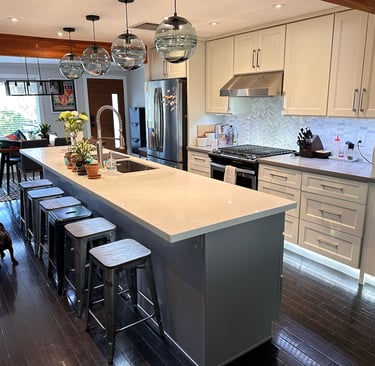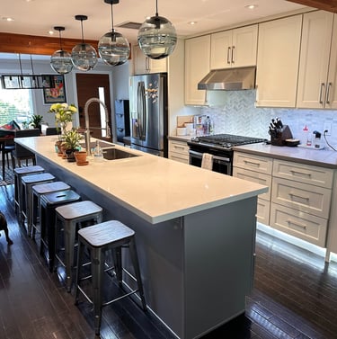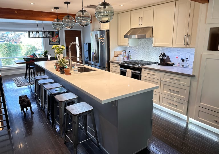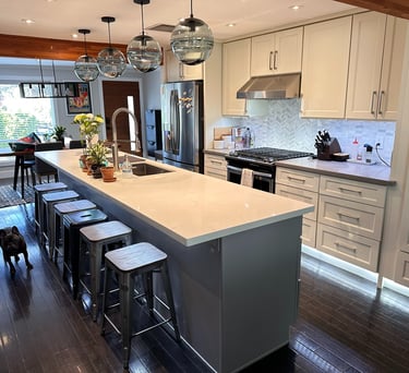 This original warbox style home had an outdated kitchen. We added a big 11' kitchen island, 3 rows of cabinets, quartz, new lighting, and new oak floors to turn this home in to a dining and entertainment hub.