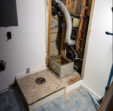 This basement bathroom had a sewage ejector pump and tank above grade. The customer wanted to make the bathroom look nice and normal. We excavated the floor and dropped the ejector sewage tank below grade and added an access cabinet for the ejector pump. Then we added updated flooring, vanity, and shower tile to give the bathroom a refreshed look.